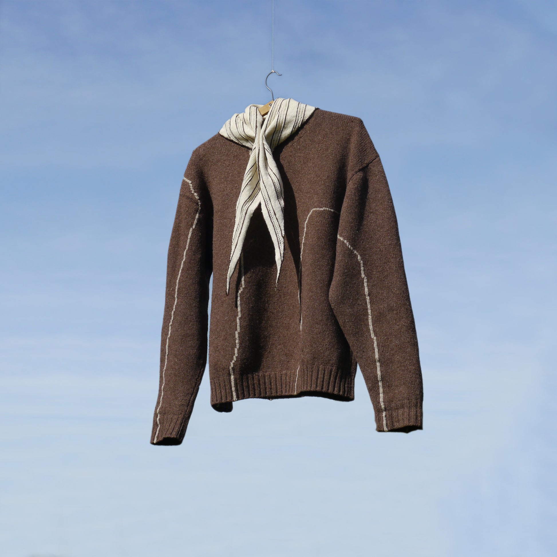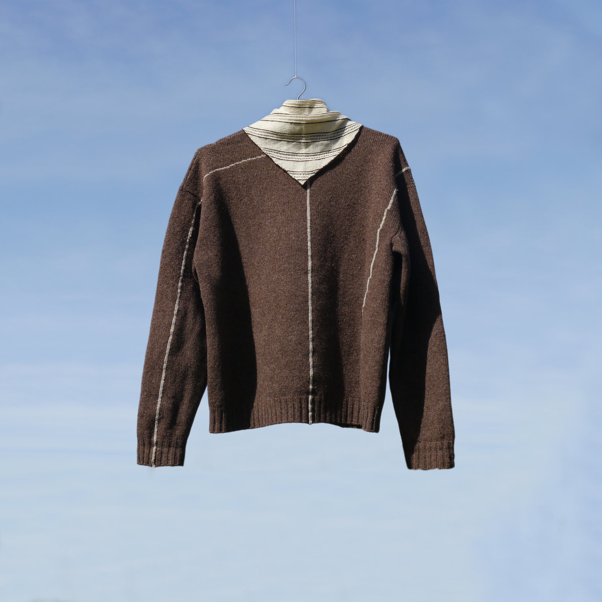Triangular bandana in undyed merino wool, worked in the natural contrast of light and dark fibers. Horizontal lace bands alternate with plain knit, outlined with hand-embroidered brown detailing. Light in structure yet softly warm, retaining the natural character of merino wool. Slowly made on a domestic knitting machine from the 1980s.