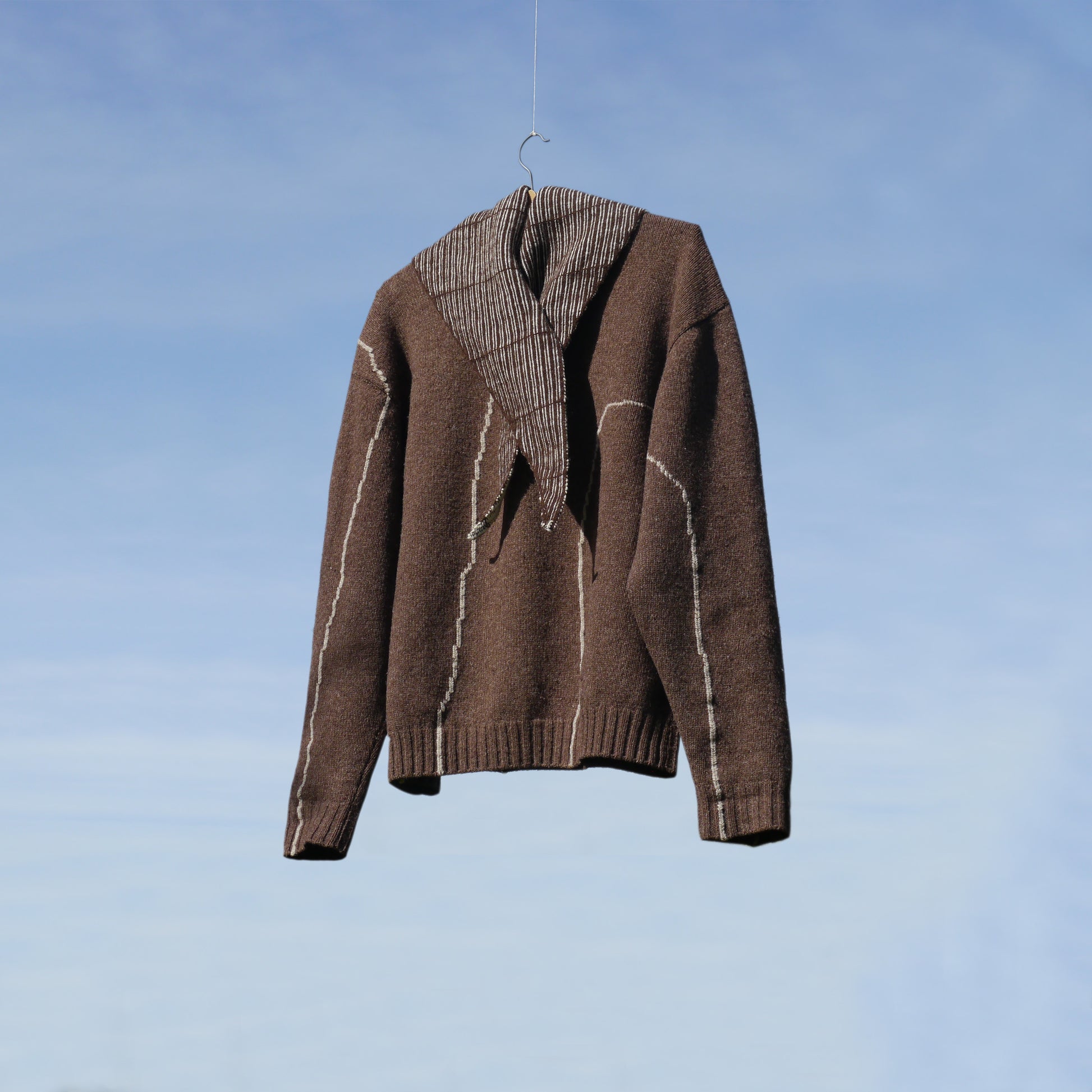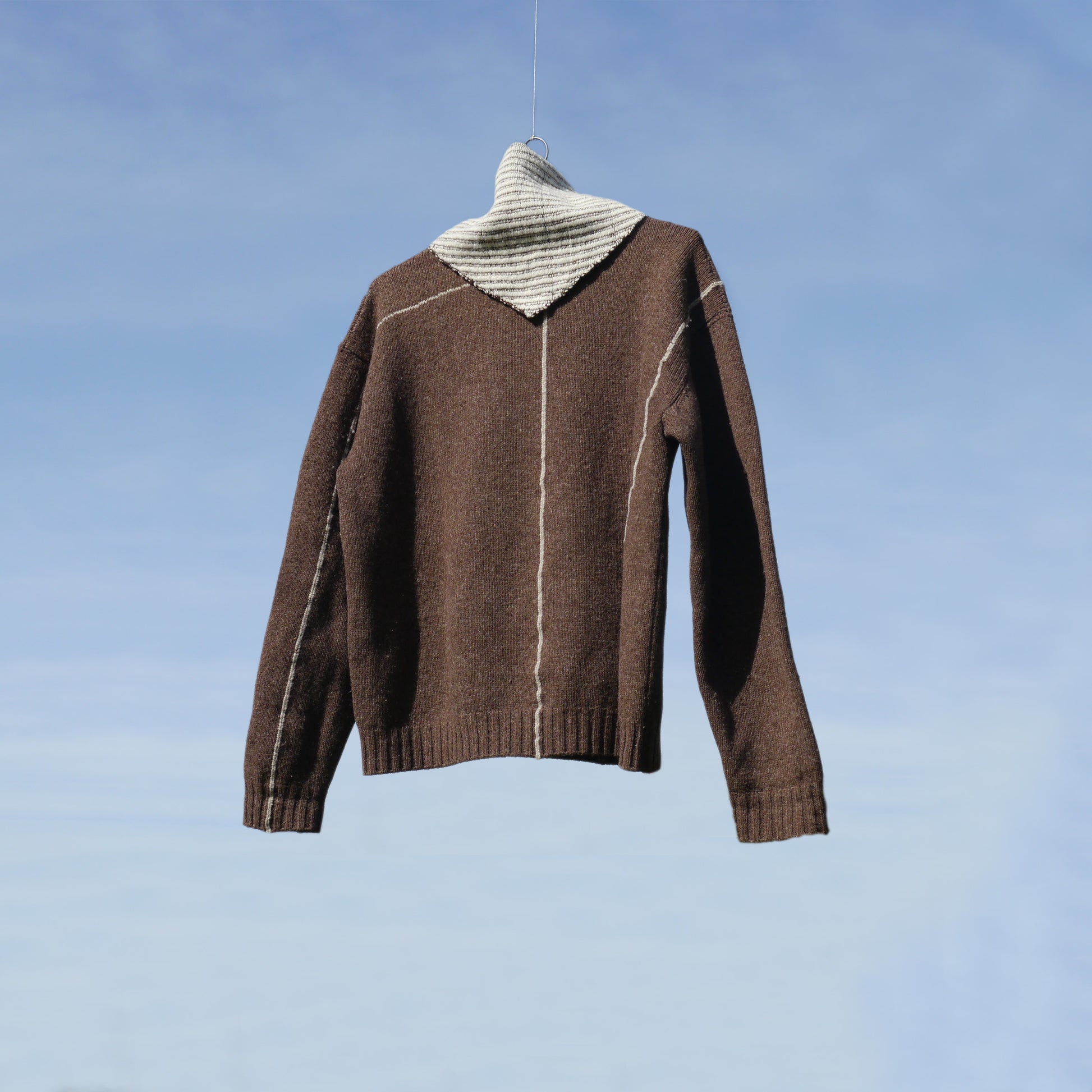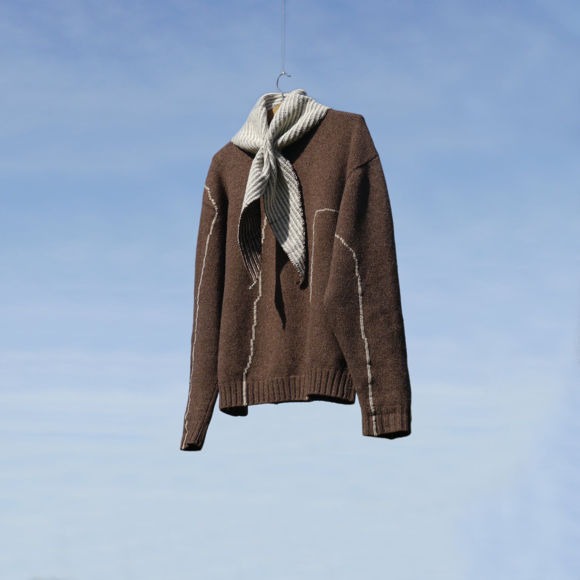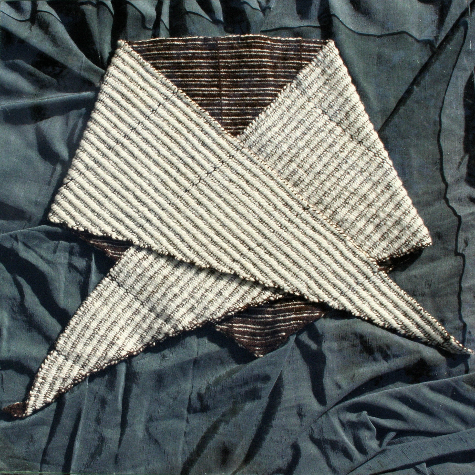 Triangular bandana in undyed merino wool, constructed from two naturally coloured yarns. A brown knitted base is interlaced by hand with white merino, using the original tones of the sheep.