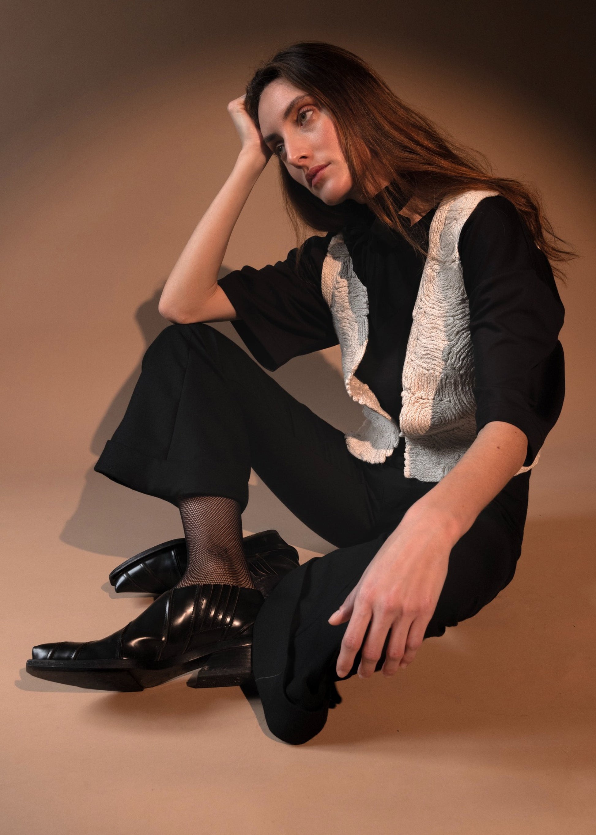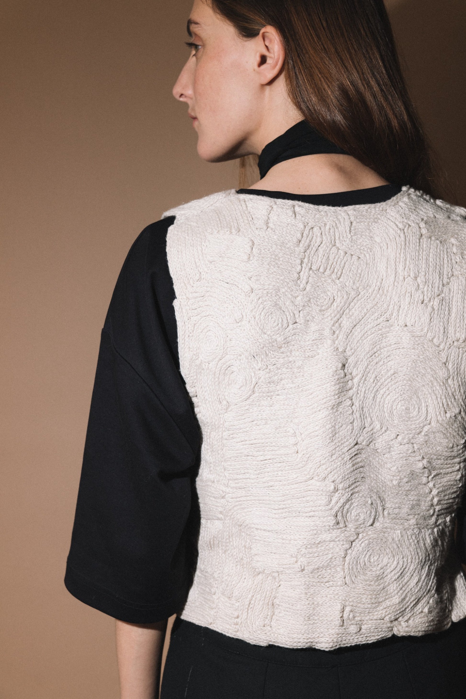 This vest is entirely handmade, with every stitch and knit crafted by hand — one of a kind, with only one piece available.